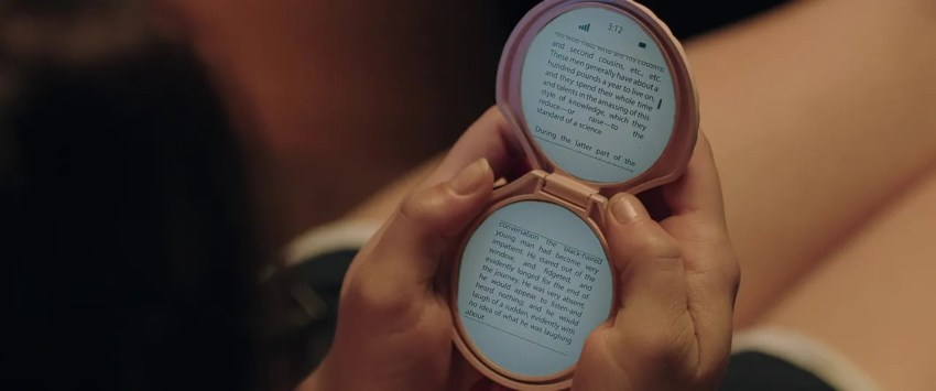 This is probably the most easily recognized clue because of one thing that’s blatantly pointed out to us: the infamous clamshell e-reader. (Which I want. Why can’t I have? WHY?)